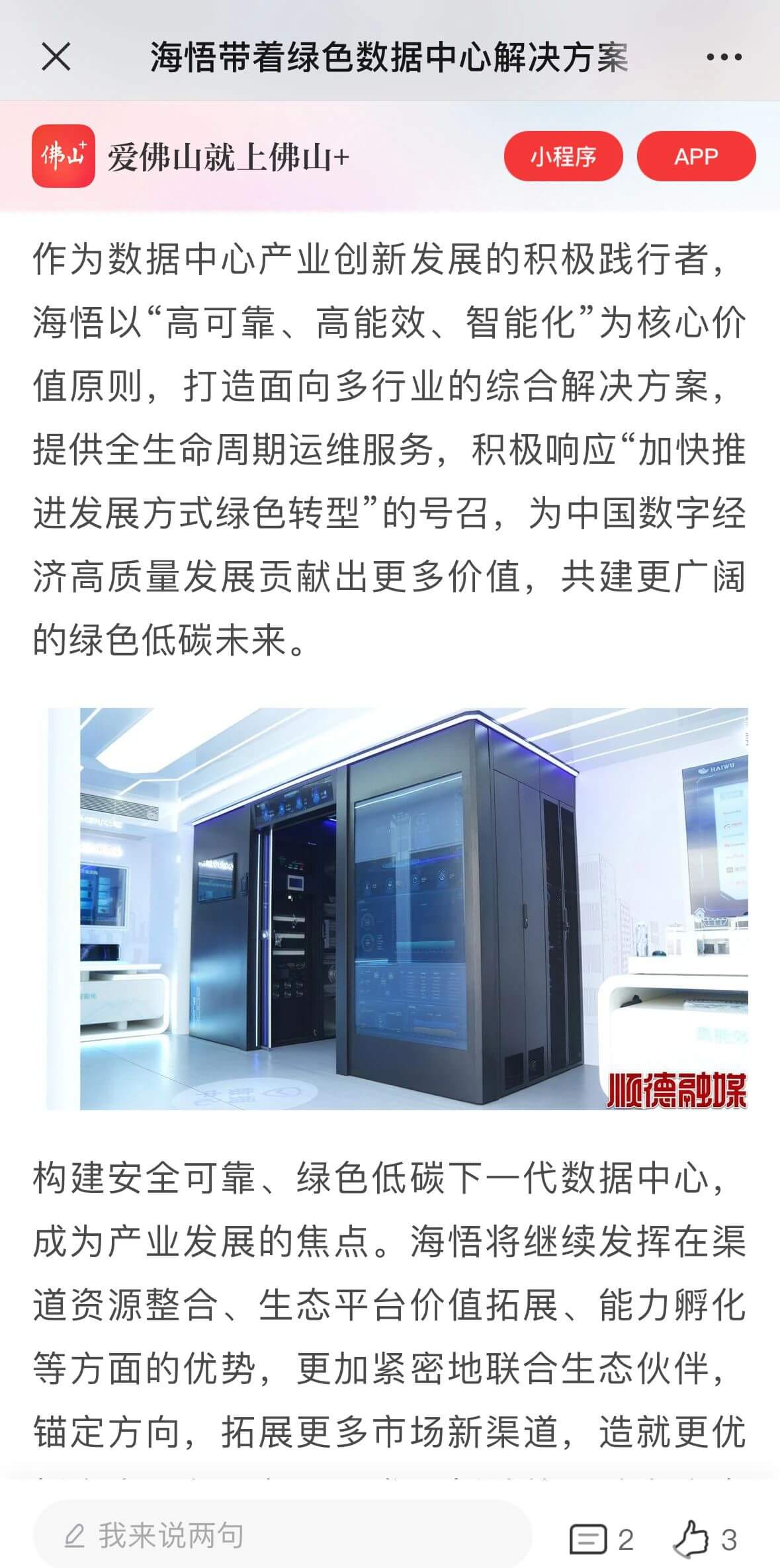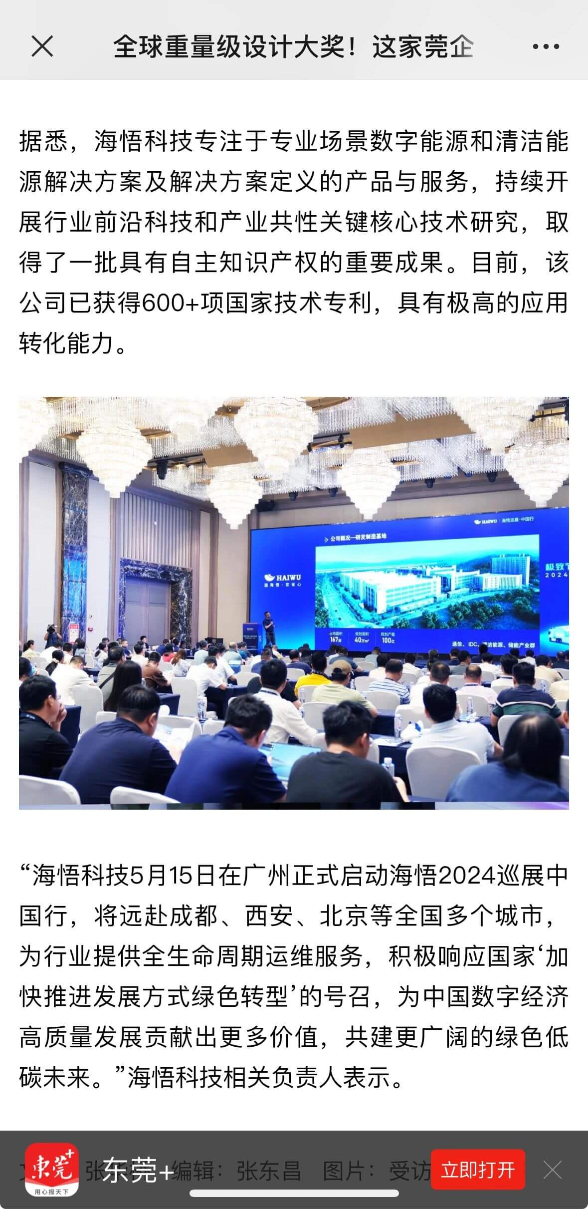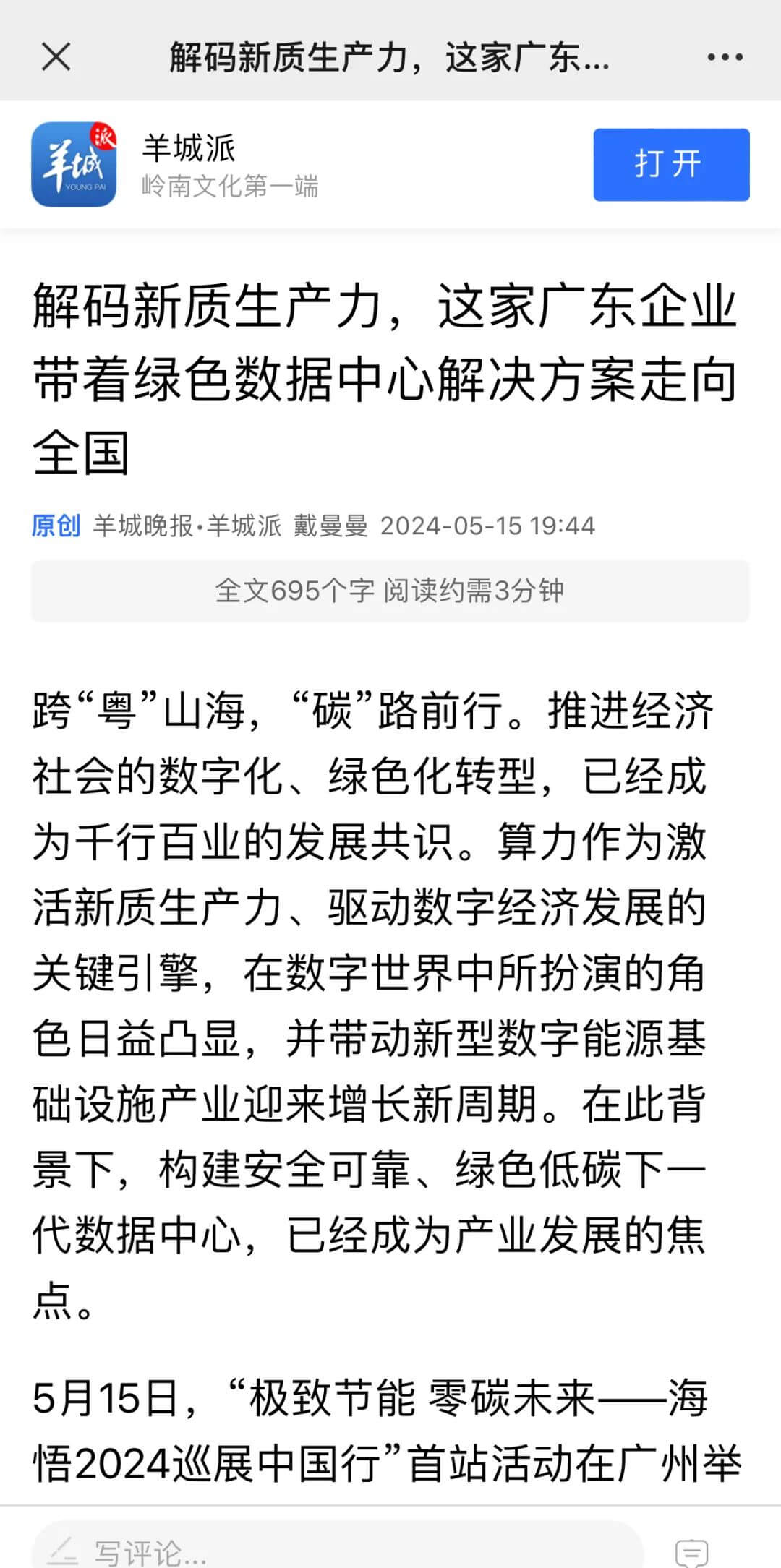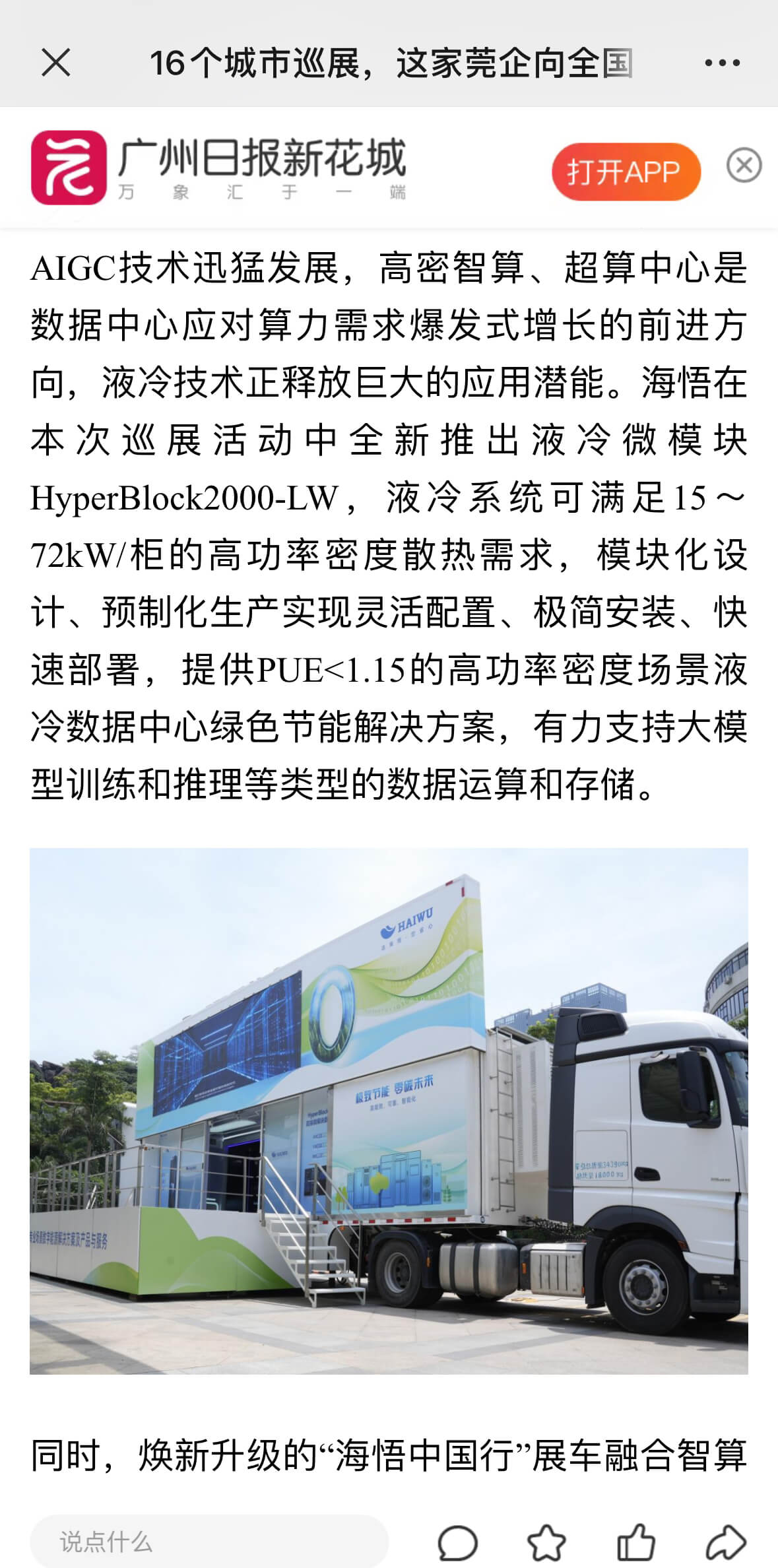 5月15日,“極致節(jié)能 零碳未來——2024海悟巡展中國行”首站活動(dòng)在廣州舉行,攜先進(jìn)數(shù)據(jù)中心綠色解決方案走向全國,羊城晚報(bào)、廣州日報(bào)、東莞+、佛山+等主流媒體關(guān)注并報(bào)道,海悟的品牌實(shí)力、解決方案能力及解決方案定義的產(chǎn)品與服務(wù)都受到社會(huì)更廣泛的認(rèn)可。