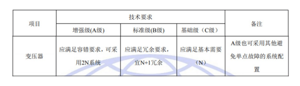 國標(biāo)GB50174-2017《數(shù)據(jù)中心設(shè)計(jì)規(guī)范》中對(duì)于A、B、C三級(jí)數(shù)據(jù)中心變壓器架構(gòu)的具體要求如下: