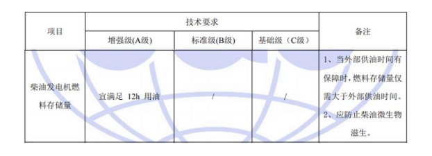 國標(biāo)GB50174-2017《數(shù)據(jù)中心設(shè)計(jì)規(guī)范》中對(duì)于A、B、C三級(jí)數(shù)據(jù)中心后備柴油發(fā)電機(jī)燃料存儲(chǔ)系統(tǒng)的具體要求如下: