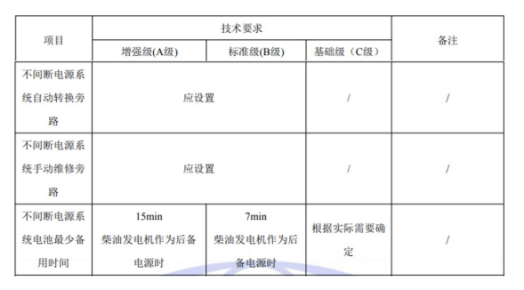 國標(biāo)GB50174-2017《數(shù)據(jù)中心設(shè)計(jì)規(guī)范》中對(duì)于A、B、C三級(jí)數(shù)據(jù)中心不間斷電源系統(tǒng)旁路及備用時(shí)間的具體要求如下: