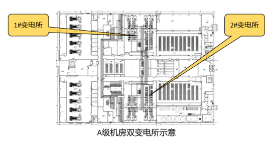 C級(jí)、B級(jí)機(jī)房無變配電所物理隔離要求;若C級(jí)、B級(jí)機(jī)房改A級(jí)機(jī)房,則每個(gè)變電所之間需做物理隔離。若配電系統(tǒng)采用2N構(gòu)架,則至少需要設(shè)置兩個(gè)物理隔離的變電所,每個(gè)變電所平時(shí)各帶50%負(fù)荷,當(dāng)一個(gè)變電所完全斷電時(shí),另一個(gè)變電所帶載100%負(fù)荷。若配電系統(tǒng)采用2+1的DR構(gòu)架,則至少需要設(shè)置三個(gè)物理隔離的變電所,每個(gè)變電所平時(shí)各帶66%負(fù)荷,當(dāng)其中一個(gè)變電所完全斷電時(shí),另兩個(gè)變電所帶載100%負(fù)荷。