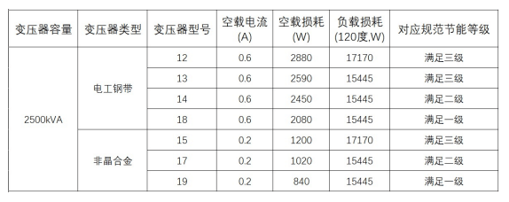選擇高效的供電設(shè)備可以降低能耗并提高供電效率,如:干式變壓器改為非晶合金變壓器后,可降低變壓器總損耗30%。其對(duì)比傳統(tǒng)變壓器的節(jié)能效果如下: