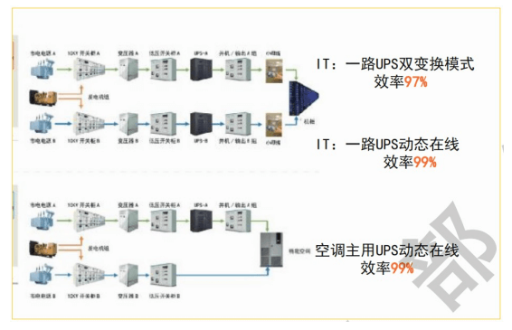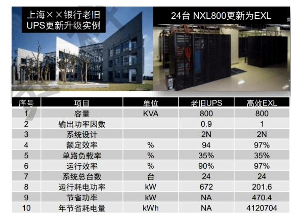 上海某銀行老舊UPS改為高效節(jié)能型UPS后,運(yùn)行效率可從90%提升至97%。