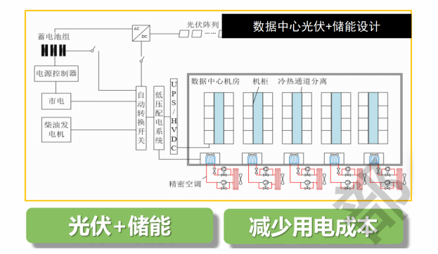 項(xiàng)目可根據(jù)當(dāng)?shù)厍闆r增加光伏儲(chǔ)能一體化設(shè)備,光伏、谷電、平電為儲(chǔ)能系統(tǒng)充電,峰電時(shí)段儲(chǔ)能系統(tǒng)放電,減少機(jī)房用電成本。