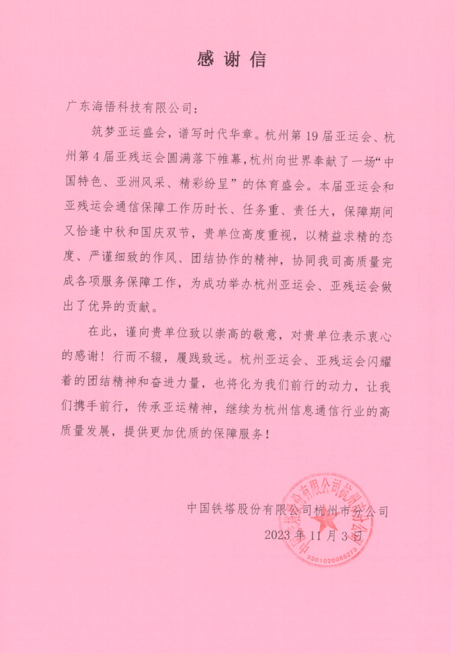 近日,海悟集團(tuán)收到中國鐵塔的感謝信,其充分肯定了海悟在杭州亞運(yùn)會(huì)、亞殘運(yùn)會(huì)通信保障工作中做出的突出貢獻(xiàn)。信中表示,本次通信保障工作歷時(shí)長、任務(wù)重、責(zé)任大,海悟以精益求精的態(tài)度、嚴(yán)謹(jǐn)細(xì)致的作風(fēng)、團(tuán)結(jié)協(xié)作的精神,協(xié)同中國鐵塔圓滿完成了各項(xiàng)通信服務(wù)保障工作,交出了護(hù)航亞運(yùn)的出色答卷。