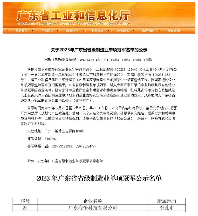 近日,廣東省工業(yè)和信息化廳公示了《2023年廣東省省級制造業(yè)單項冠軍名單》,廣東海悟科技有限公司憑借卓越的自主創(chuàng)新能力和生產制造能力,成功獲評“2023年廣東省省級制造業(yè)單項冠軍”!