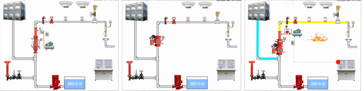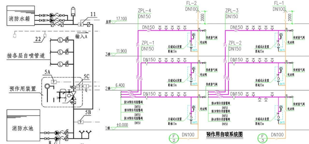預(yù)作用自動(dòng)噴水滅火系統(tǒng)系統(tǒng)原理圖以及實(shí)際項(xiàng)目系統(tǒng)圖如下所示: