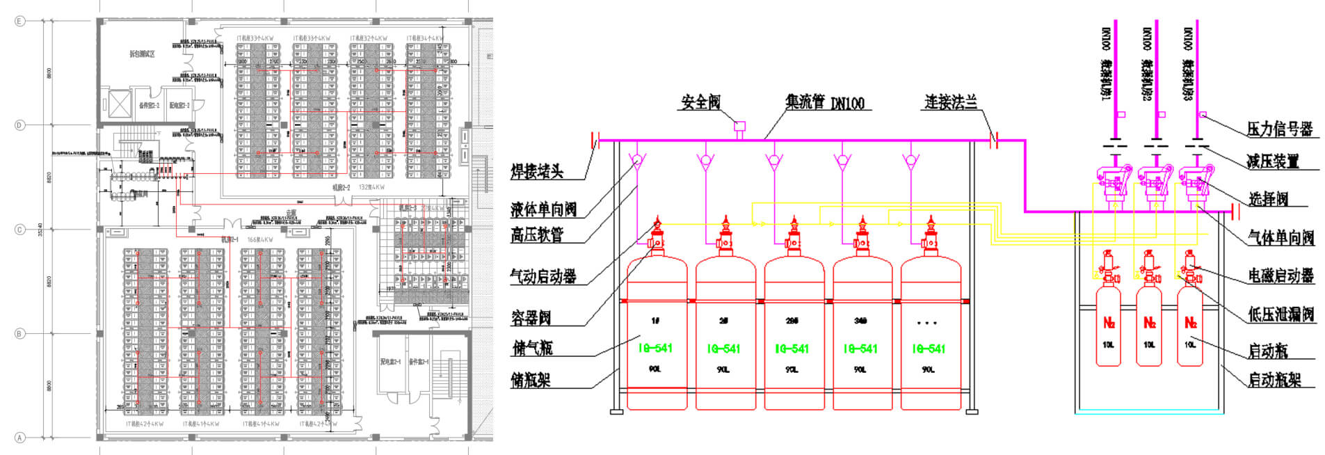 管網(wǎng)式七氟丙烷氣體滅火系統(tǒng)保護(hù)距離短,常用于小型防護(hù)區(qū)、獨(dú)立防護(hù)區(qū)、鋼瓶間與防護(hù)區(qū)距離近的場所,其輸送距離為40~60m。IG541氣體滅火系統(tǒng)保護(hù)距離長,常用于大型工程、大規(guī)模組合分配的項(xiàng)目,其輸送距離一級充壓系統(tǒng)為70~90m;二級充壓系統(tǒng)為100~120m。