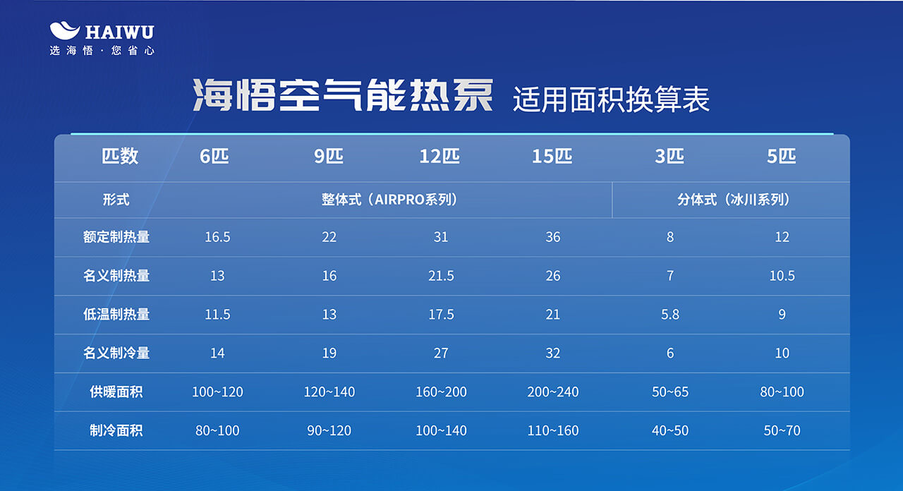 接下來,我們根據(jù)常見的空氣能熱泵匹數(shù)與供暖面積對照表,為您詳細解讀如何根據(jù)自家面積選擇合適的熱泵匹數(shù)。