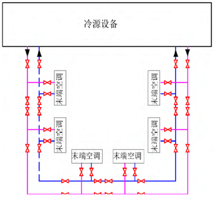 兩種方案相似但有不同,最明顯的差異是冷卻液管路的不同。為了實現(xiàn)冷卻液循環(huán)的連續(xù)性,避免單點故障,根據(jù)各自建筑條件,項目A冷卻液管路采用雙供雙回的方式,項目B采用環(huán)形管路的方式,均可實現(xiàn)系統(tǒng)的冗余,見圖 5 和圖 6。通過對比分析,兩種方式實現(xiàn)的功能和可靠性是一致的,系統(tǒng)管路各有特點,實際應用過程中可以結(jié)合不同建筑布局、尺寸面積、出柜率,以及運維通道等進行選擇。