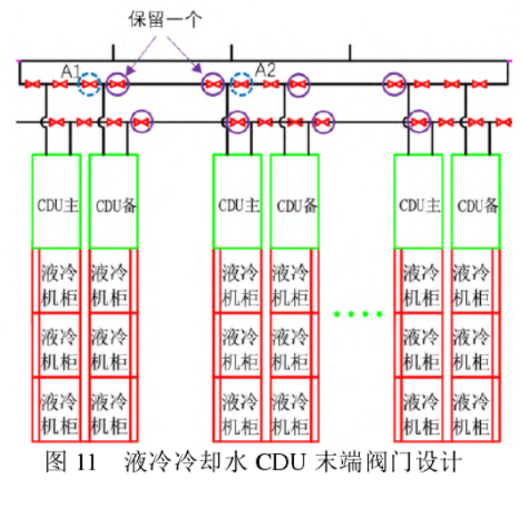 系統(tǒng)改造過程中,需要特別關(guān)注如下幾方面。一是原有冷卻水系統(tǒng)水質(zhì)運行情況,如果水質(zhì)運行不良,為避免切換到冷凍水作為冷源運行時污染冷凍水系統(tǒng),可以在冷凍水回水管路上增加過濾器進行處理后再回到總的冷凍水大管網(wǎng)系統(tǒng)中。二是切換過程中,需要分別核算下液冷CDU分別在冷卻水系統(tǒng)和冷凍水系統(tǒng)運行時管網(wǎng)的壓力大小,兩者接近最優(yōu),如果冷凍水運行的壓力高于冷卻水運行的壓力,切換過程中重點關(guān)注閥門切換的時間,同時要監(jiān)測好冷凍水系統(tǒng)自身的補水處于正常運行工況,避免冷凍水壓力快速下降,影響到自身的運行。三是冷卻水管路上的閥門設(shè)置,要避免過設(shè)計超配閥門,避免不加分析的直接使用傳統(tǒng)冷凍水系統(tǒng)管路的閥門設(shè)計方式。按照GB50174-2017《數(shù)據(jù)中心設(shè)計規(guī)范》,末端設(shè)備如冷凍水精密空調(diào)通常按照N+1設(shè)計,也即是有1臺備用;為實現(xiàn)運行過程中閥門單點故障時檢修更換,通常末端設(shè)備,會連續(xù)設(shè)計2個閥門,見圖 10[12],當其中一個閥門故障時,可以關(guān)閉該故障閥門左右相鄰的閥門,只需要停機1臺設(shè)備,而不影響主用設(shè)備數(shù)量的正常使用。但是對于液冷系統(tǒng),通常CDU是1用1備,相鄰的一組也是1用1備,兩組CDU之間的閥門,完全可以有原來的2個閥門只保留1個閥門;當其中一個閥門故障時,可以通過關(guān)閉A1和A2閥門來實現(xiàn)隔斷功能,見圖 11。雖然需要停機2臺CDU,但2組設(shè)備各有1臺備用不會影響到設(shè)備的正常使用。