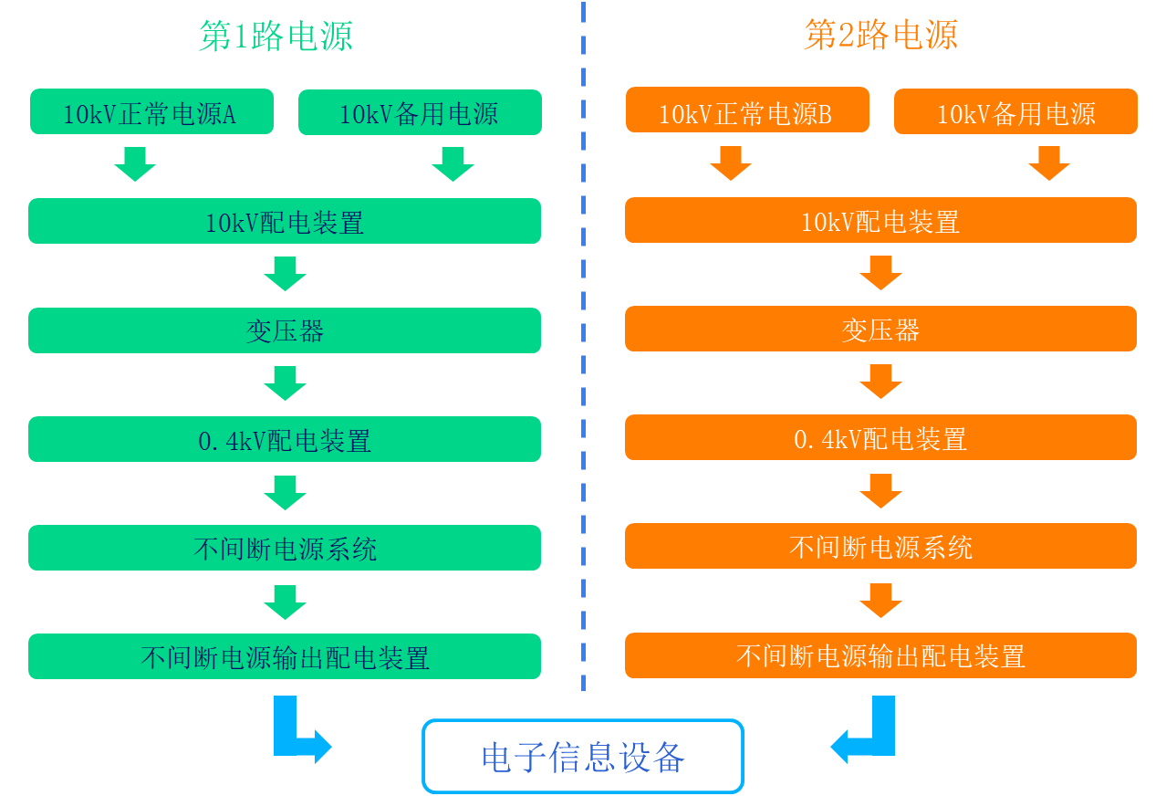 A級(jí)數(shù)據(jù)中心由雙路電源供電,并設(shè)置備用電源。正常運(yùn)行時(shí),數(shù)據(jù)中心由雙路電源供電,每路電源承擔(dān)50%的負(fù)荷;當(dāng)一路電源出現(xiàn)故障,另一路電源承擔(dān)全部負(fù)荷;當(dāng)兩路電源都出現(xiàn)故障,備用電源投入運(yùn)行,承擔(dān)全部負(fù)荷的需要。