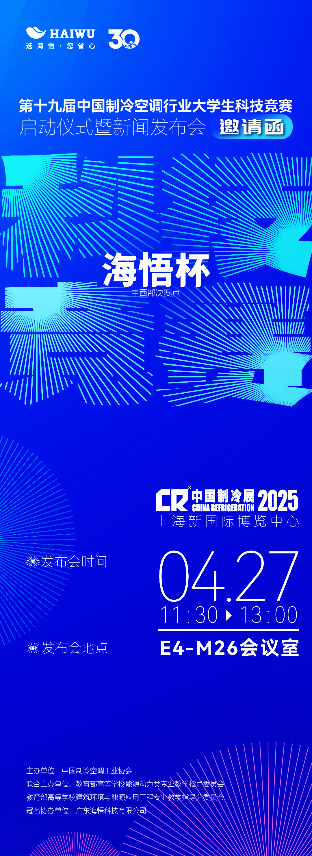 2025 年 4 月 27 日,在第三十六屆國際制冷、空調(diào)、供暖、通風及食品冷凍加工展覽會(“2025 中國制冷展”)期間,于上海新國際博覽中心,一場意義非凡的啟動儀式暨新聞發(fā)布會盛大舉行 —— 由廣東海悟科技有限公司贊助協(xié)辦、中國制冷空調(diào)工業(yè)協(xié)會聯(lián)合舉辦的 2025 第十九屆中國制冷空調(diào)行業(yè)大學生科技競賽正式拉開帷幕。