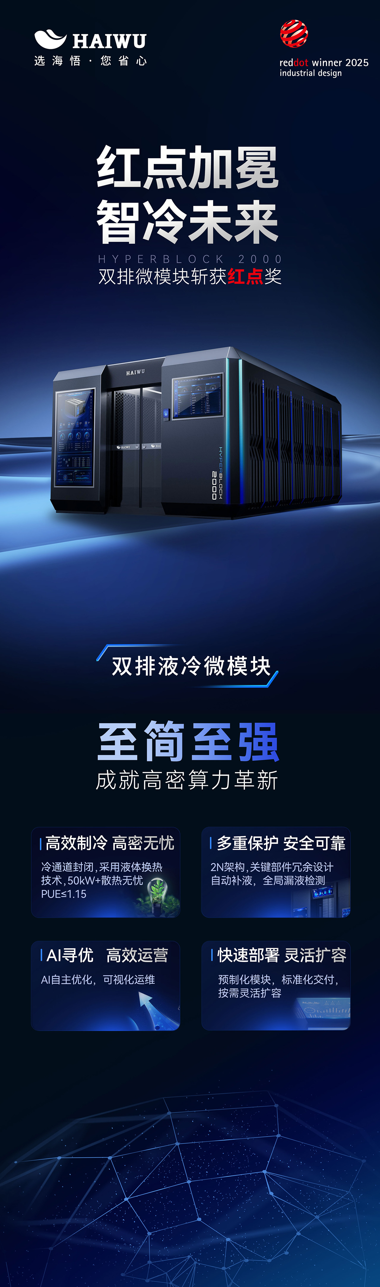 德國紅點(diǎn)獎創(chuàng)立于1955年,與德國"iF獎"、美國IDEA獎、日本Good Design獎并稱為世界四大設(shè)計(jì)獎,被譽(yù)為"工業(yè)設(shè)計(jì)的奧斯卡"。其評選標(biāo)準(zhǔn)涵蓋創(chuàng)新性、功能性、可持續(xù)性、美學(xué)等維度,獲獎作品往往代表行業(yè)技術(shù)前沿與設(shè)計(jì)趨勢。海悟HYPERBLOCK 2000的獲獎,意味著其模塊化數(shù)據(jù)中心解決方案在能效、可靠性、可擴(kuò)展性等方面已達(dá)到國際頂尖水平。