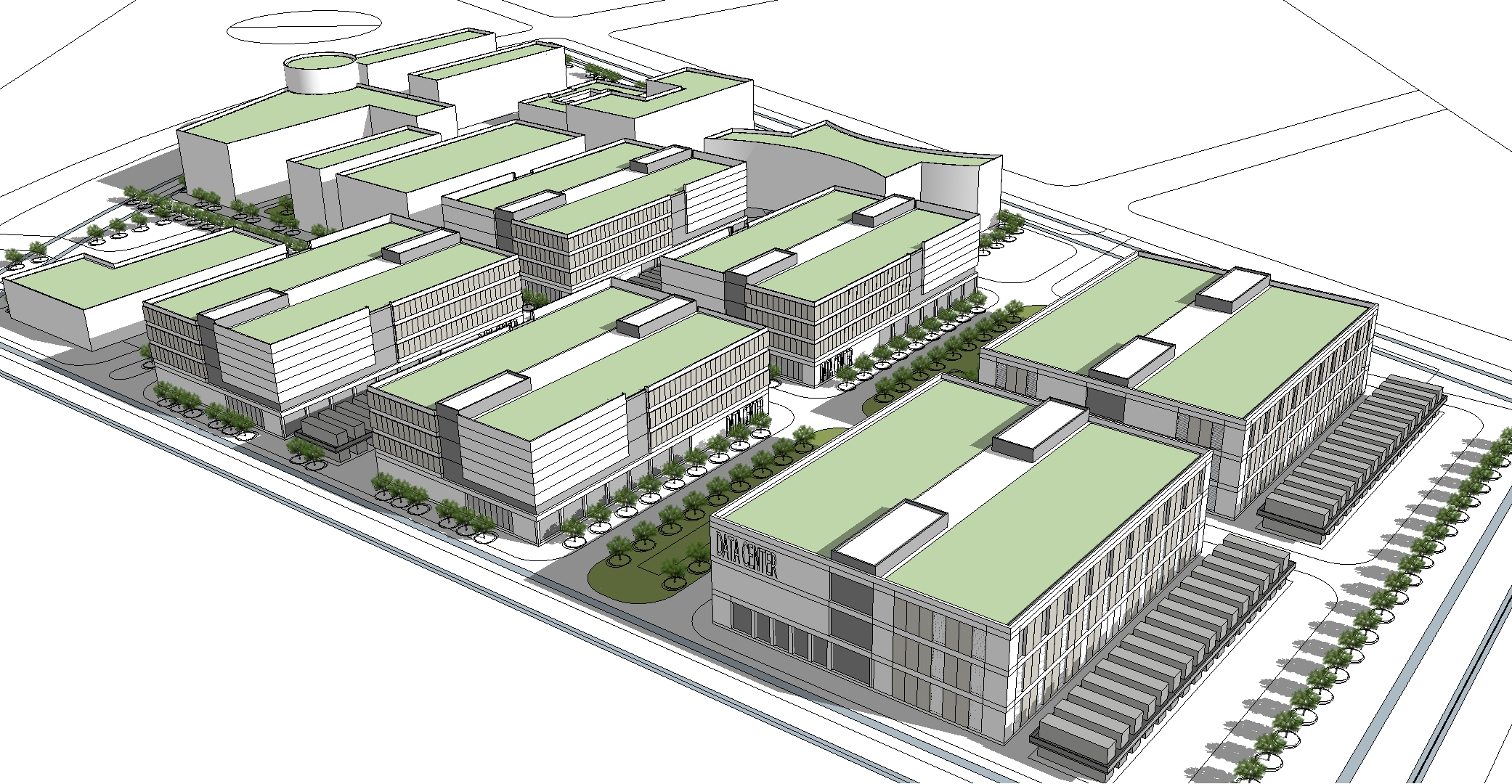 本項(xiàng)目園區(qū)位于南京,總用地面積132397.65m² ,總建筑面積184535.82m²,共設(shè)計(jì)6棟數(shù)據(jù)中心(其中4棟采用水冷方案,2棟采用間接蒸發(fā)方案)、2棟宿舍樓、1棟研發(fā)樓、1棟運(yùn)維管理中心、1棟綜合服務(wù)中心、1棟行政辦公樓、1棟作為220kV變電站。